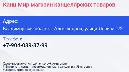 Канц Мир, магазин канцелярских товаров по адресу Владимирская область, Александров, улица Ленина, 22 в дальнейшем Организация, размещена в следующих категориях: