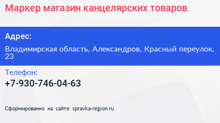Маркер, магазин канцелярских товаров по адресу Владимирская область, Александров, Красный переулок, 23 в дальнейшем Организация, размещена в следующих категориях: