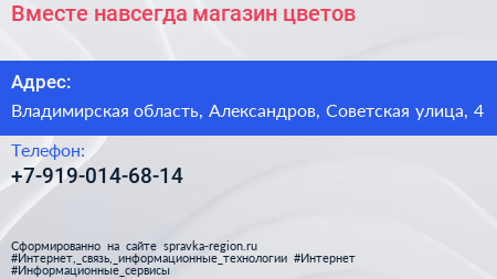 Вместе навсегда, магазин цветов по адресу Владимирская область, Александров, Советская улица, 4 в дальнейшем Организация, размещена в следующих категориях: