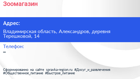 Зоомагазин по адресу Владимирская область, Александров, деревня Терешковой, 14 в дальнейшем Организация, размещена в следующих категориях:
