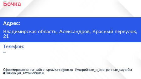 Бочка по адресу Владимирская область, Александров, Красный переулок, 21 в дальнейшем Организация, размещена в следующих категориях: