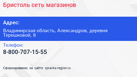 Бристоль, сеть магазинов по адресу Владимирская область, Александров, деревня Терешковой, 8 в дальнейшем Организация, размещена в следующих категориях: