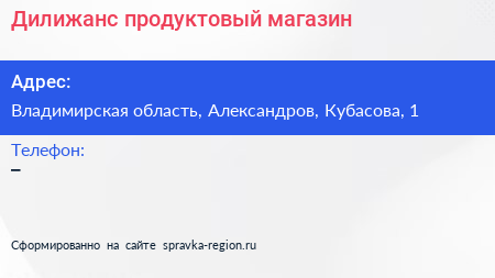 Дилижанс, продуктовый магазин по адресу Владимирская область, Александров, Кубасова, 1 в дальнейшем Организация, размещена в следующих категориях: