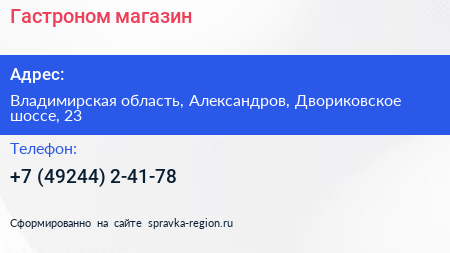 Гастроном, магазин по адресу Владимирская область, Александров, Двориковское шоссе, 23 в дальнейшем Организация, размещена в следующих категориях:
