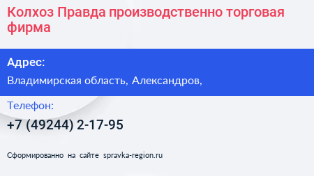 Колхоз Правда, производственно-торговая фирма по адресу Владимирская область, Александров, в дальнейшем Организация, размещена в следующих категориях: