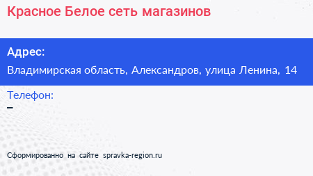 Красное & Белое, сеть магазинов по адресу Владимирская область, Александров, улица Ленина, 14 в дальнейшем Организация, размещена в следующих категориях: