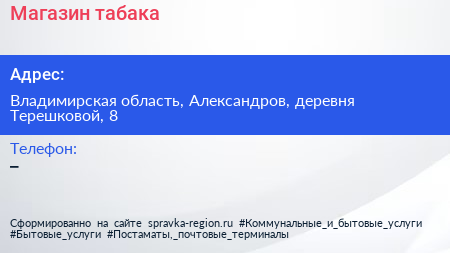 Магазин табака по адресу Владимирская область, Александров, деревня Терешковой, 8 в дальнейшем Организация, размещена в следующих категориях: