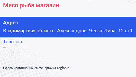 Мясо-рыба, магазин по адресу Владимирская область, Александров, Ческа-Липа, 12 ст1 в дальнейшем Организация, размещена в следующих категориях: