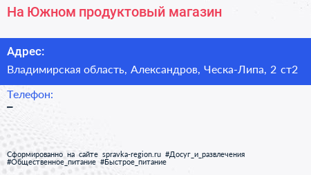 На Южном, продуктовый магазин по адресу Владимирская область, Александров, Ческа-Липа, 2 ст2 в дальнейшем Организация, размещена в следующих категориях: