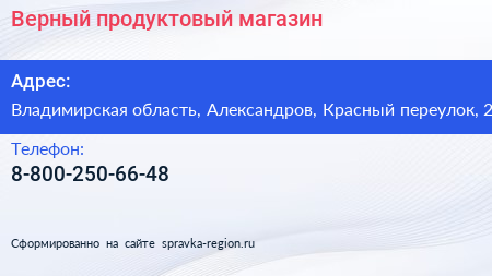 Верный, продуктовый магазин по адресу Владимирская область, Александров, Красный переулок, 2 в дальнейшем Организация, размещена в следующих категориях: