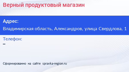 Верный, продуктовый магазин по адресу Владимирская область, Александров, улица Свердлова, 1 в дальнейшем Организация, размещена в следующих категориях: