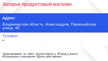 Загорье, продуктовый магазин по адресу Владимирская область, Александров, Первомайская улица, 48 в дальнейшем Организация, размещена в следующих категориях: