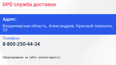 DPD, служба доставки по адресу Владимирская область, Александров, Красный переулок, 13 в дальнейшем Организация, размещена в следующих категориях: