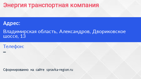 Энергия, транспортная компания по адресу Владимирская область, Александров, Двориковское шоссе, 13 в дальнейшем Организация, размещена в следующих категориях: