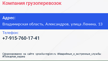 Компания грузоперевозок по адресу Владимирская область, Александров, улица Ленина, 13 в дальнейшем Организация, размещена в следующих категориях: