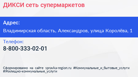 ДИКСИ, сеть супермаркетов по адресу Владимирская область, Александров, улица Королёва, 1 в дальнейшем Организация, размещена в следующих категориях: