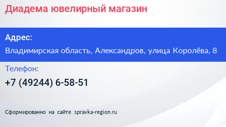 Диадема, ювелирный магазин по адресу Владимирская область, Александров, улица Королёва, 8 в дальнейшем Организация, размещена в следующих категориях: