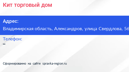 Кит, торговый дом по адресу Владимирская область, Александров, улица Свердлова, 56 в дальнейшем Организация, размещена в следующих категориях: