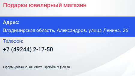 Подарки, ювелирный магазин по адресу Владимирская область, Александров, улица Ленина, 26 в дальнейшем Организация, размещена в следующих категориях: