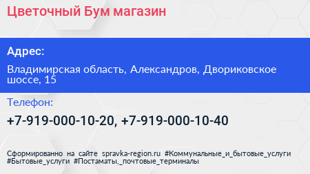 Цветочный Бум, магазин по адресу Владимирская область, Александров, Двориковское шоссе, 15 в дальнейшем Организация, размещена в следующих категориях: