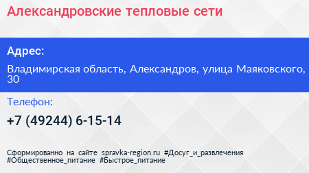 Александровские тепловые сети по адресу Владимирская область, Александров, улица Маяковского, 30 в дальнейшем Организация, размещена в следующих категориях: