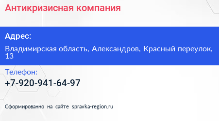 Антикризисная компания по адресу Владимирская область, Александров, Красный переулок, 13 в дальнейшем Организация, размещена в следующих категориях: