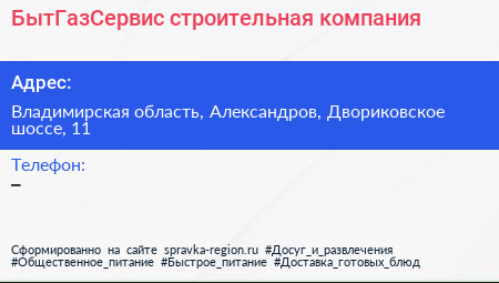БытГазСервис, строительная компания по адресу Владимирская область, Александров, Двориковское шоссе, 11 в дальнейшем Организация, размещена в следующих категориях:
