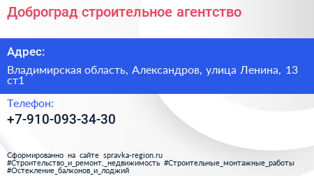 Доброград, строительное агентство по адресу Владимирская область, Александров, улица Ленина, 13 ст1 в дальнейшем Организация, размещена в следующих категориях: