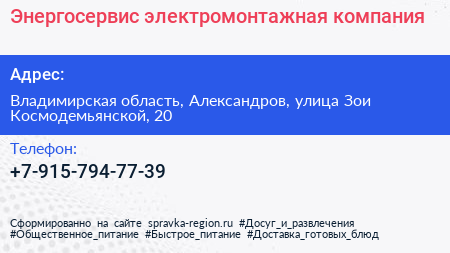 Энергосервис, электромонтажная компания по адресу Владимирская область, Александров, улица Зои Космодемьянской, 20 в дальнейшем Организация, размещена в следующих категориях: