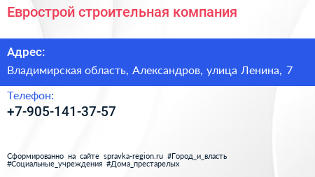 Еврострой, строительная компания по адресу Владимирская область, Александров, улица Ленина, 7 в дальнейшем Организация, размещена в следующих категориях: