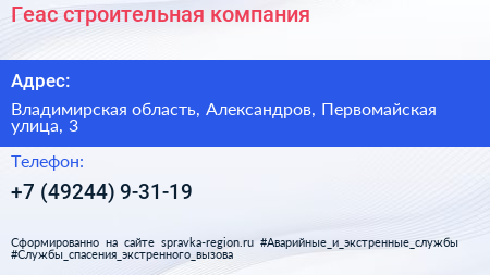 Геас, строительная компания по адресу Владимирская область, Александров, Первомайская улица, 3 в дальнейшем Организация, размещена в следующих категориях: