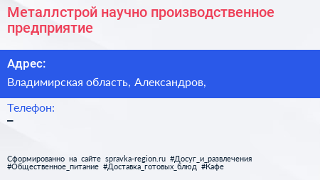 Металлстрой, научно-производственное предприятие по адресу Владимирская область, Александров, в дальнейшем Организация, размещена в следующих категориях: