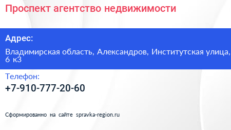 Проспект, агентство недвижимости по адресу Владимирская область, Александров, Институтская улица, 6 к3 в дальнейшем Организация, размещена в следующих категориях: