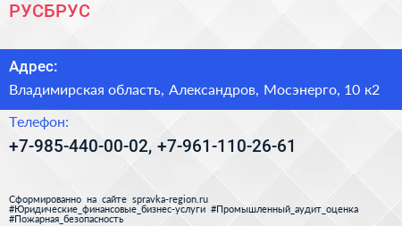 РУСБРУС по адресу Владимирская область, Александров, Мосэнерго, 10 к2 в дальнейшем Организация, размещена в следующих категориях: