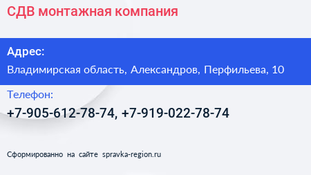 СДВ, монтажная компания по адресу Владимирская область, Александров, Перфильева, 10 в дальнейшем Организация, размещена в следующих категориях: