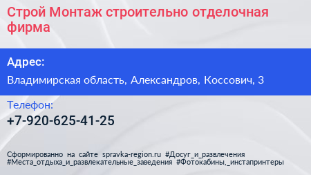 Строй-Монтаж, строительно-отделочная фирма по адресу Владимирская область, Александров, Коссович, 3 в дальнейшем Организация, размещена в следующих категориях: