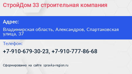 СтройДом 33, строительная компания по адресу Владимирская область, Александров, Спартаковская улица, 37 в дальнейшем Организация, размещена в следующих категориях: