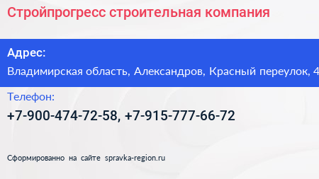Стройпрогресс, строительная компания по адресу Владимирская область, Александров, Красный переулок, 4 в дальнейшем Организация, размещена в следующих категориях: