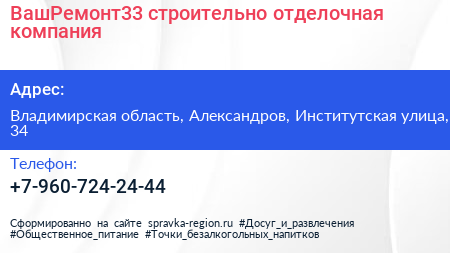 ВашРемонт33, строительно-отделочная компания по адресу Владимирская область, Александров, Институтская улица, 34 в дальнейшем Организация, размещена в следующих категориях: