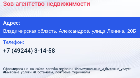 Зов, агентство недвижимости по адресу Владимирская область, Александров, улица Ленина, 20Б в дальнейшем Организация, размещена в следующих категориях: