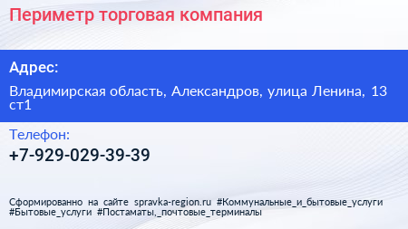 Периметр, торговая компания по адресу Владимирская область, Александров, улица Ленина, 13 ст1 в дальнейшем Организация, размещена в следующих категориях: