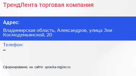 ТрендЛента, торговая компания по адресу Владимирская область, Александров, улица Зои Космодемьянской, 20 в дальнейшем Организация, размещена в следующих категориях: