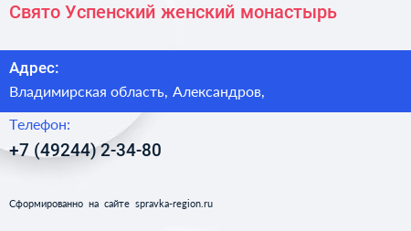 Свято-Успенский женский монастырь по адресу Владимирская область, Александров, в дальнейшем Организация, размещена в следующих категориях: