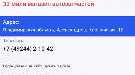 33 мили, магазин автозапчастей по адресу Владимирская область, Александров, Киржачская, 1Б в дальнейшем Организация, размещена в следующих категориях: