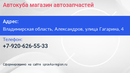 Автокуба, магазин автозапчастей по адресу Владимирская область, Александров, улица Гагарина, 4 в дальнейшем Организация, размещена в следующих категориях: