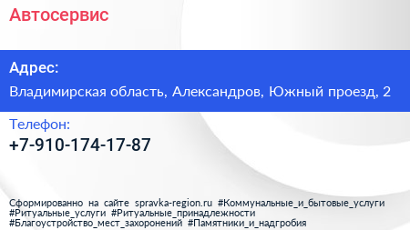 Автосервис по адресу Владимирская область, Александров, Южный проезд, 2 в дальнейшем Организация, размещена в следующих категориях: