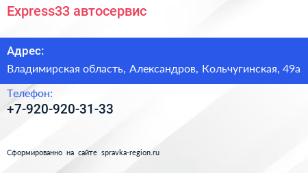 Express33, автосервис по адресу Владимирская область, Александров, Кольчугинская, 49а в дальнейшем Организация, размещена в следующих категориях: