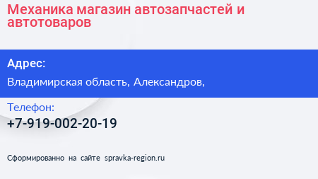 Механика, магазин автозапчастей и автотоваров по адресу Владимирская область, Александров, в дальнейшем Организация, размещена в следующих категориях: