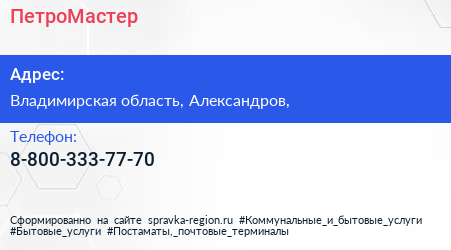 ПетроМастер по адресу Владимирская область, Александров, в дальнейшем Организация, размещена в следующих категориях: