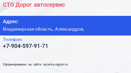 СТО Дорог, автосервис по адресу Владимирская область, Александров, в дальнейшем Организация, размещена в следующих категориях: